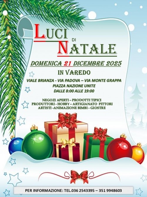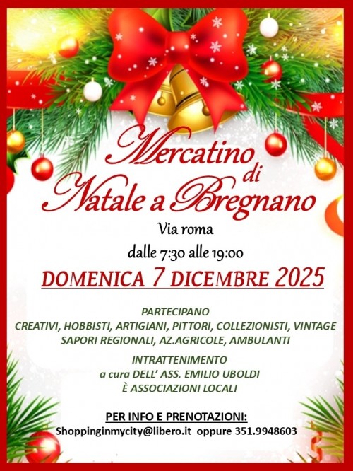 7 DICEMBRE– «MERCATINI DI NATALE» in BREGNANO VIA ROMA ORARRI 7.30/19.00 PARTECIPANO: HOBBISTI, PITTORI, CREATORI OPI, COLLEZIONISTI,ARTIGIANI SAPORI REGIONALI , AZ.AGRICOLE, AMBULANTI - NO CORRENTE.
